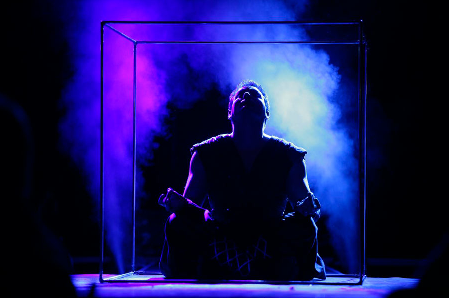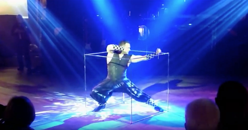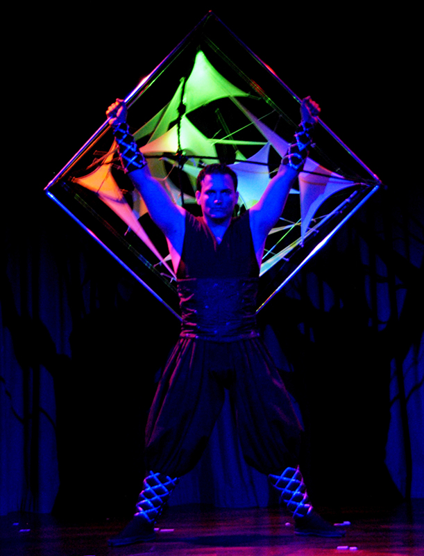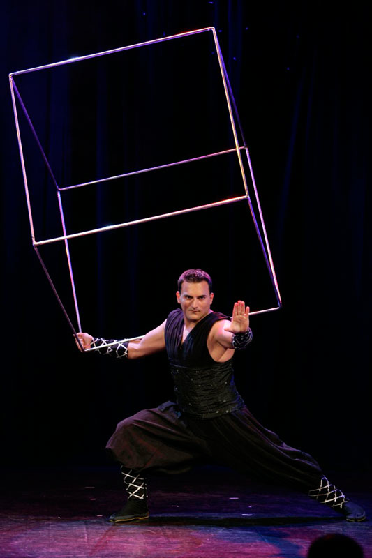 Kraftakrobatik und magische Kubusrotation. Diese dynamische Bewegungsperformance vereint artistische Höchstleistung, geschmiedeten Stahl und seidige Tücher zu einem Gesamtkunstwerk. Der Artist dreht den Würfel um seinen Körper und zeigt damit und darauf akrobatische Figuren.